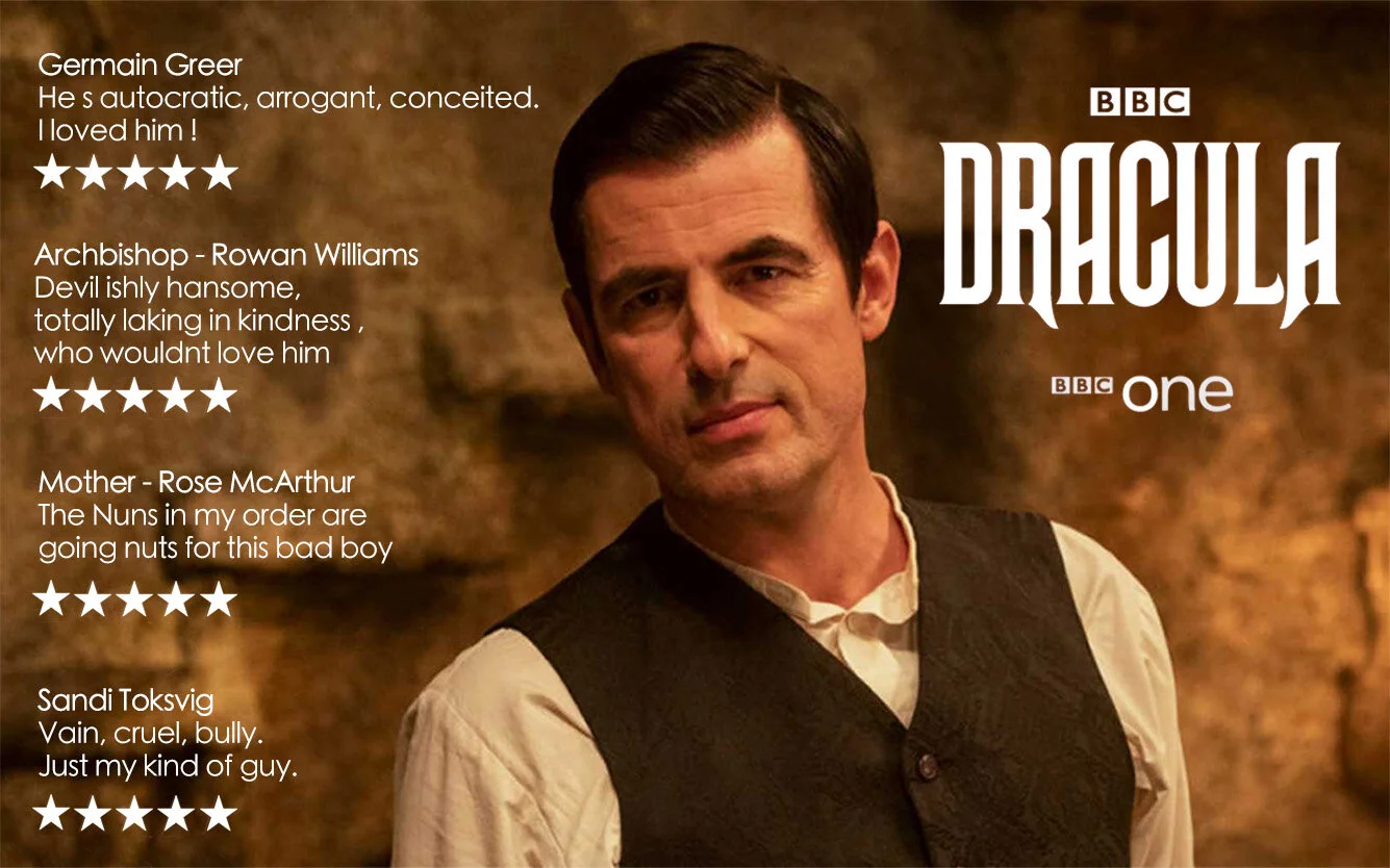 While at BBC creative, one of the programs I worked on was the new Drama series of Dracula. The producers of the show wanted the advertising to focus on the handsome main actor playing Dracula, to make him a heart throb. They specified he must look gorgeous and be featured in all the work. But Dracula is loathsome, he’s old, rich, vain, manipulative, lacks empathy and wants to kill us all. Basically, he’s psychopath. How do we make everyone fall in love with someone like that?